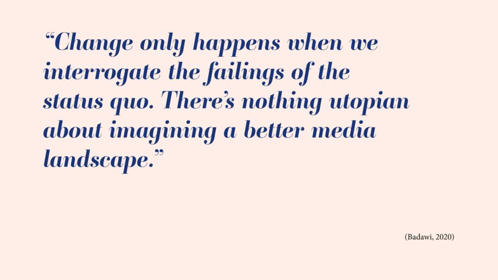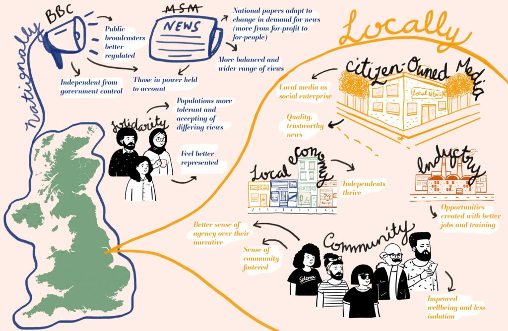 Instead of a media that’s divisive it could create connections and foster a better sense of community. Instead of invoking outrage and pessimism it could promote and celebrate the everyday good whilst also being mindful of the importance of reporting the truth. Instead of voicing narrow-minded, singular views, it could be better at providing a platform for diverse voices more representative of the people it serves. Instead of an agenda set on pushing profits, it could put people first and offer more support for independent businesses to boost local economies.