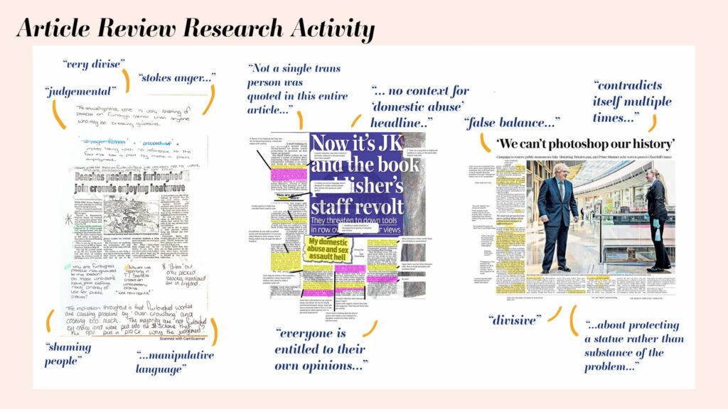 In order to gain better insight into the current state of media I reviewed articles from the 'main' papers and highlighted uses of language, tone and the type of information being told/not told. I also opened up this activity to the general public to gain their thoughts and opinions too. Above, are a few of their responses. What I found was a media that's a mouthpiece for the elite, not for the people; a media that is singular and narrow-minded; and instead of holding those in power to account, they are instead given more space to voice their opinions.