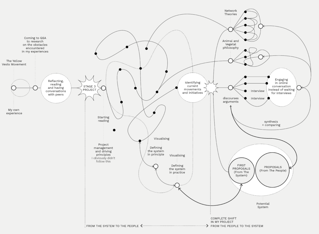 Communities started to appear as potential counter-powers. As this topic is political I didn’t want my work to get resumed to political divides between left or right discourses. I tried to search for analogies to support my arguments. I decided to look at network theories and animal and vegetal philosophy. Our system is a constellation of networks and these philosophies have the benefit to replace us in a wider ecosystem which gives my research another legitimacy, beyond political ideology. They are incredible sources of inspiration and offer us spaces and perspective to dream. Ultimately putting in perspective experts‘ point of view with them allow me to compare current interactions and modes of assembling, of co existence, and see what can be improved or challenged.