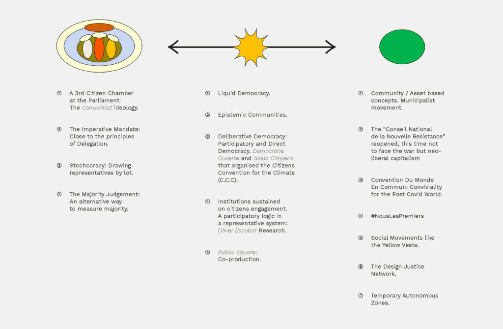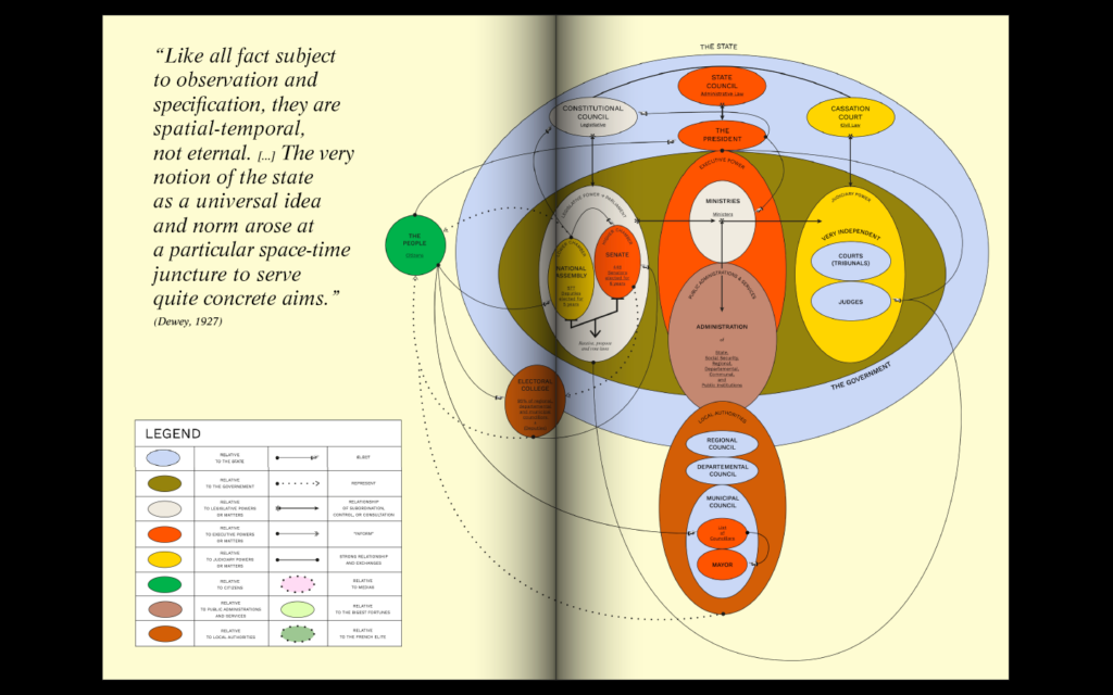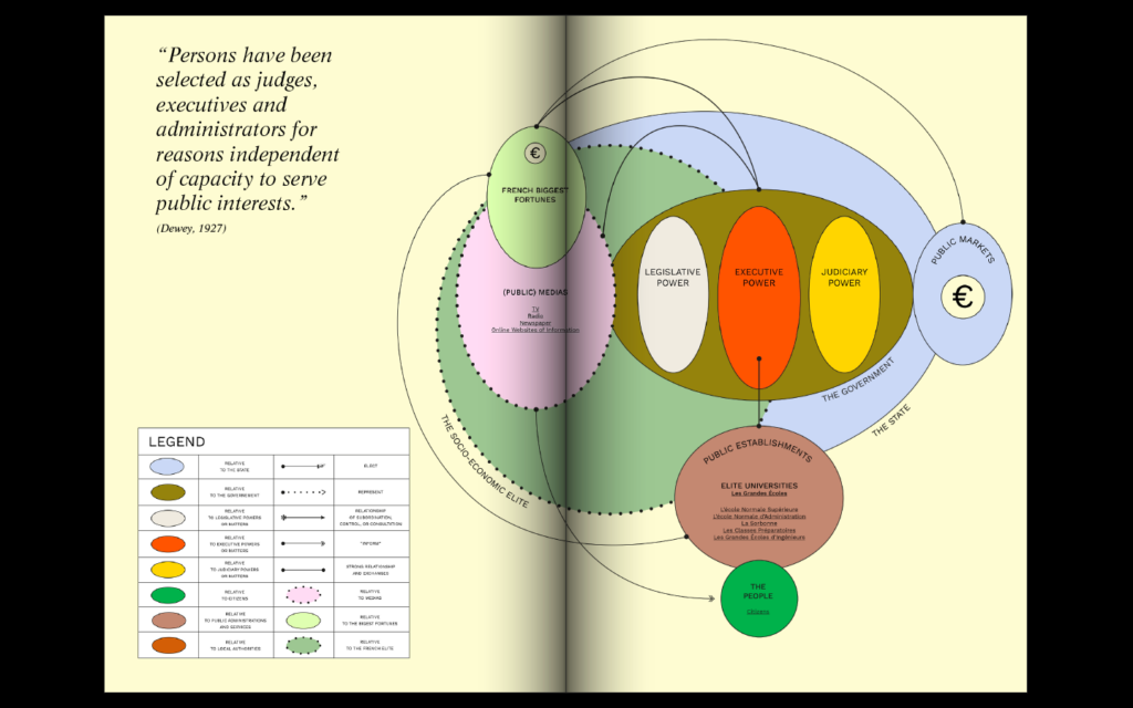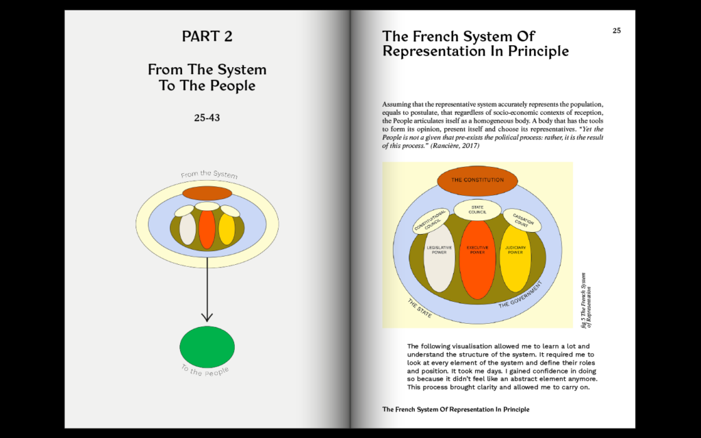 I looked at the French political system as a case study. I wanted to understand and analyse its philosophy, history, structure, interactions, practices and the roles played by experts and public institutions because the « problem » seemed to be structural. I was hoping this will enable me to define precisely fractures in the political system and identify entry points for small-short circuits or even restructurations.