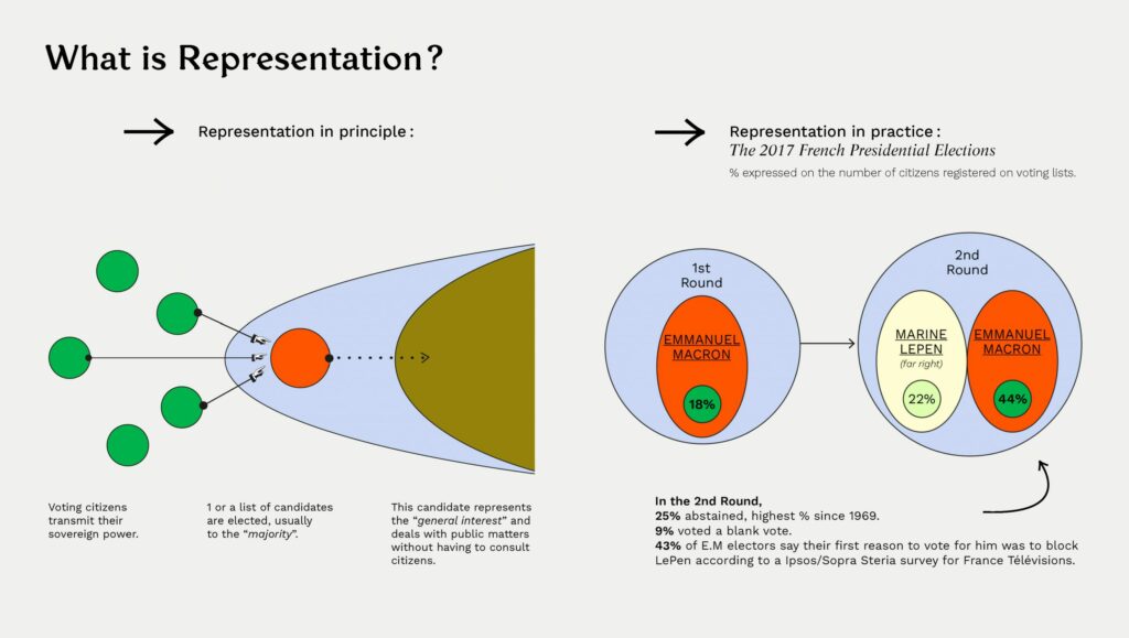 The question of representation is a complex and subjective one. Improvements can come from both the system and the people. There is plenty of room for that. The problem was never really about representation itself, but about all that it presupposes. To me, what seems primordial is to create common cultures of democracy. Ones that (re)shape our relationships to ourselves and others, to public matters and to the public sphere. This exercise was held for centuries by the same people. Today it seems like we need to collectively (re)define.