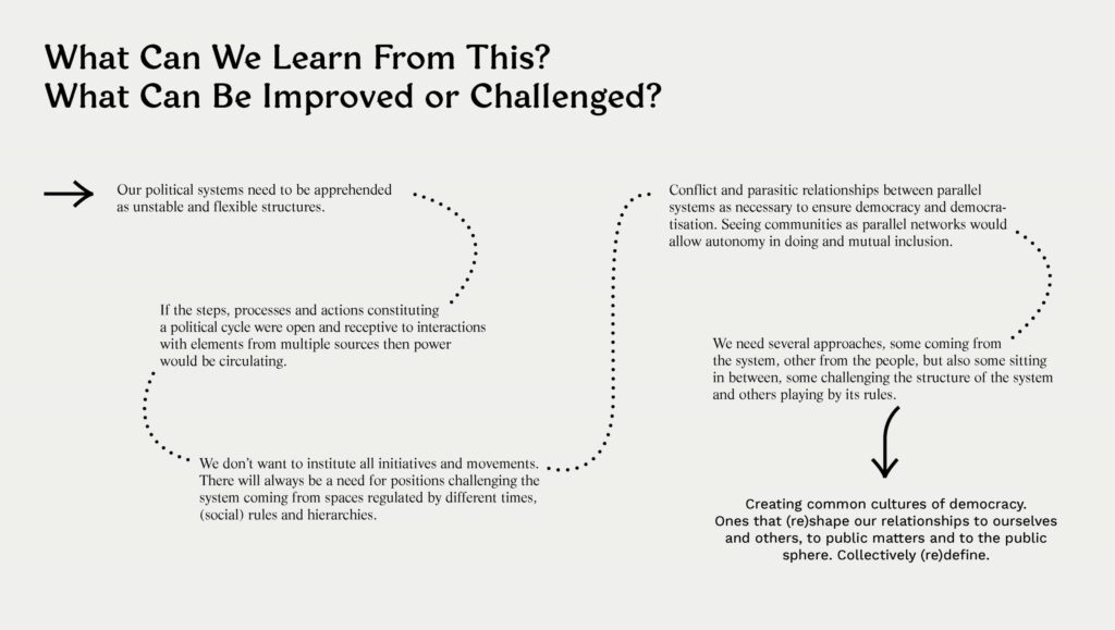 Our political systems need to be apprehended as unstable and flexible structures which is not comfortable. If the steps, processes and actions constituting a political cycle were open and receptive to interactions with elements from multiple sources then power would be circulating. But equally, we don’t want to institute all initiatives and movements. There will always be a need for positions challenging the system coming from spaces regulated by different times, (social) rules and hierarchies. This is not about standardising procedures but rather seeing conflict and parasitic relationships between parallel systems as necessary to ensure democracy and democratisation. Seeing communities as parallel networks would allow autonomy in doing and mutual inclusion. There is not a single answer to representation. It seems that we need several approaches, some coming from the system, other from the people, but also some sitting in between, some challenging the structure of the system and others playing by its rules. While animal philosophy and network theories legitimatise people’s claim to share power it also show that hierarchic structures can be necessary. Experts conversations confirm this as well.