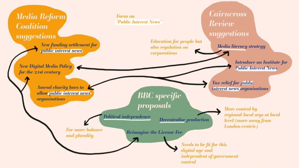 Here I've highlighted some of the proposals put forward by the Media Reform Coalition and Caincross Review. Although there were some points I disagreed with, there were others that had credibility. For the ones highlighted here, there's a strong focus on the importance of public interest news, being independent of government and the need to redefine funding structures.