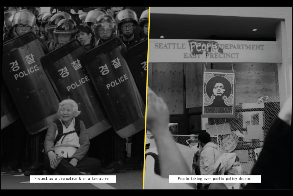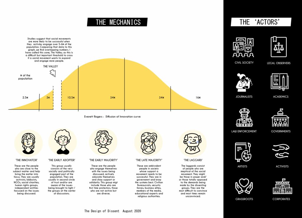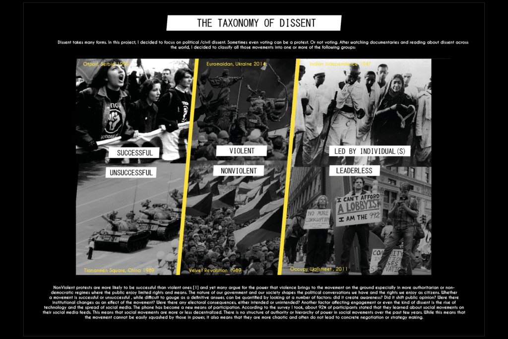 Through this project, I sought to create a taxonomy and anatomy of dissent. If the taxonomy familiarizes us to the different types of structures of a protest movement, the anatomy tells us about the people that populate it.