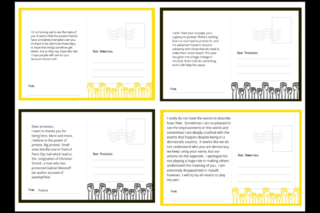 As part of my project, I asked people to fill in postcards marked Dear Democracy and Dear Protester. These are just a few examples of postcards I have received so far. This seeks to start conversations and promote solidarity among people.
