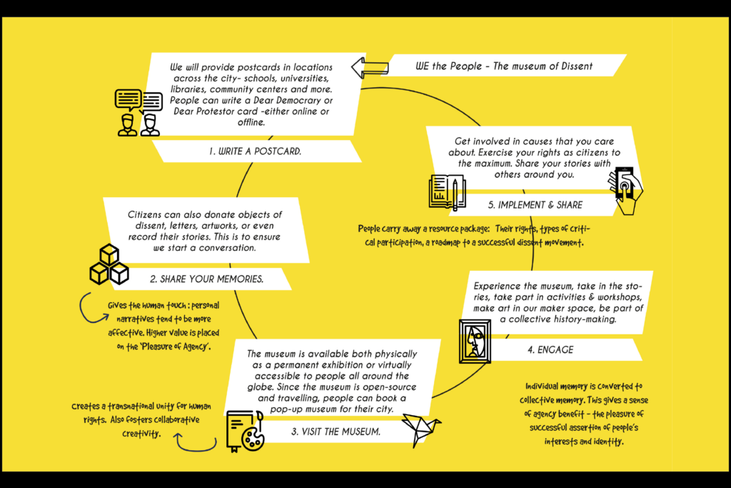 WE the people, combines public pedagogy and participatory design to create a Museum of Dissent. It is a co-curated and co-created space where citizens can educate themselves about the various ways of critically participating in government. The basis of the idea is simple: it is by the people, for the people and of the people.
