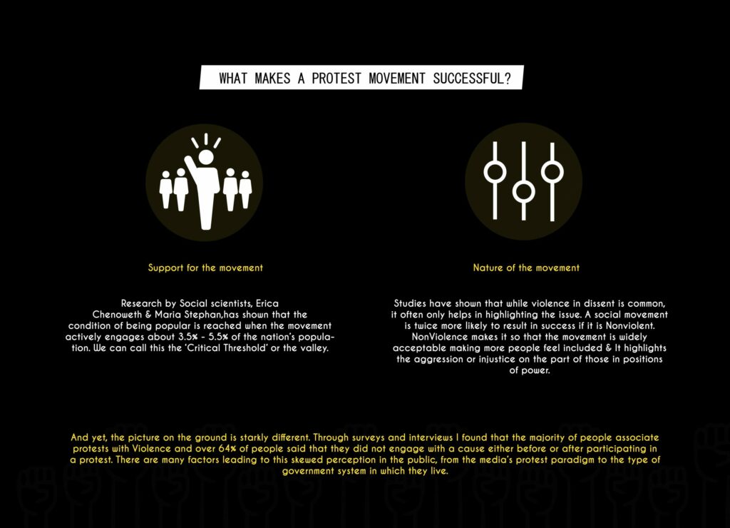 Even though social movements are more likely to be successful if they are nonviolent and engage more than 5.5% of the population, there is stark gap between how people think about social movements. When asked to say 5 words about protest, most people said the word violence and over tow-thirds of the people I interviewed said that they did not engage in causes either after or before attending a 'protest/ march'.