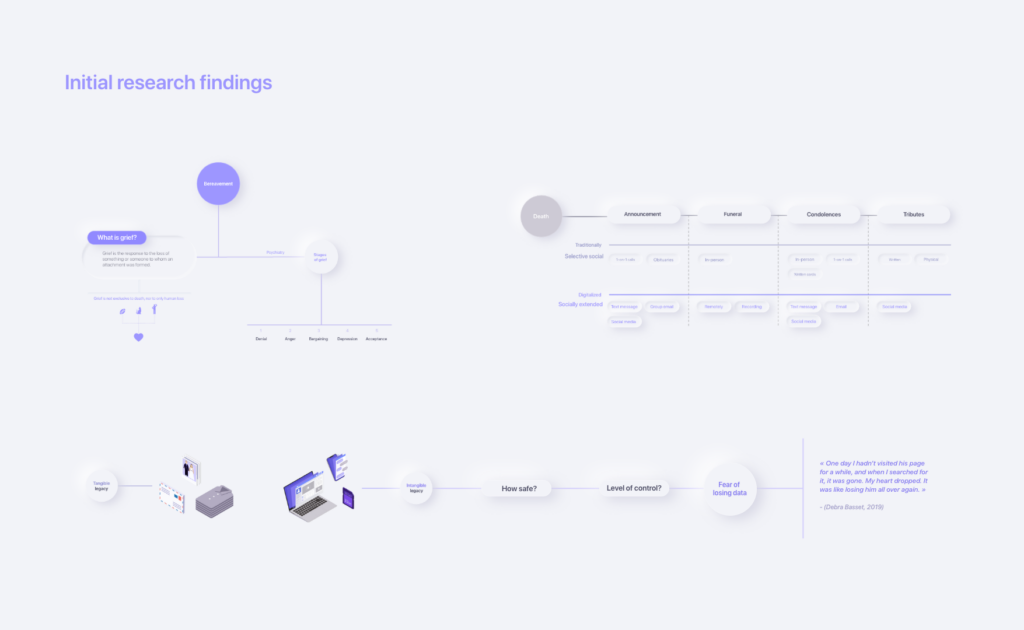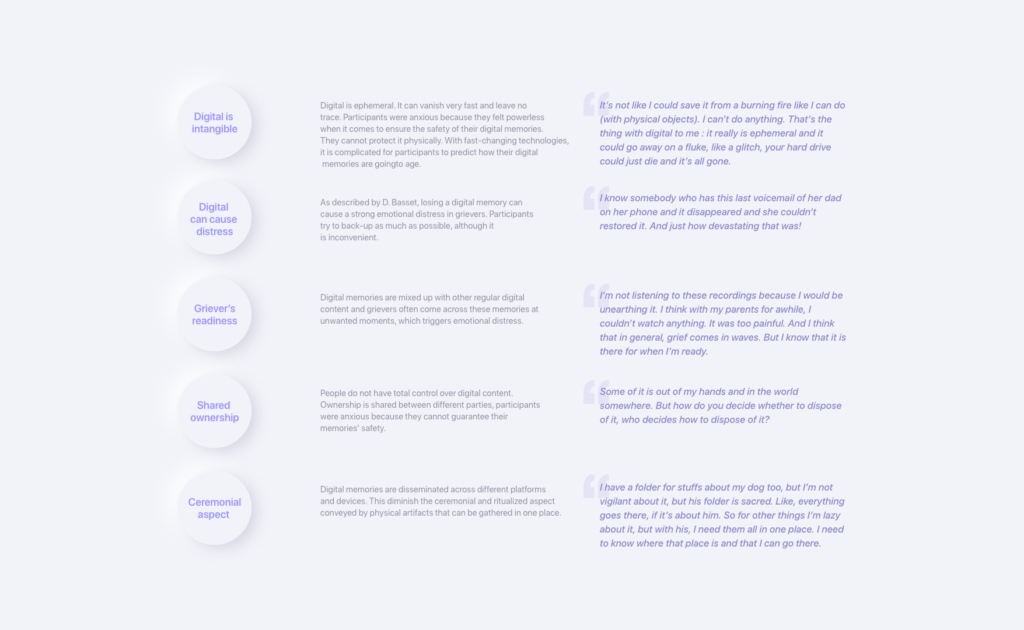 Understanding of what grief is Experience map and mourning practices with and without digital technologies Digital legacy and second-loss anxiety (Basset)