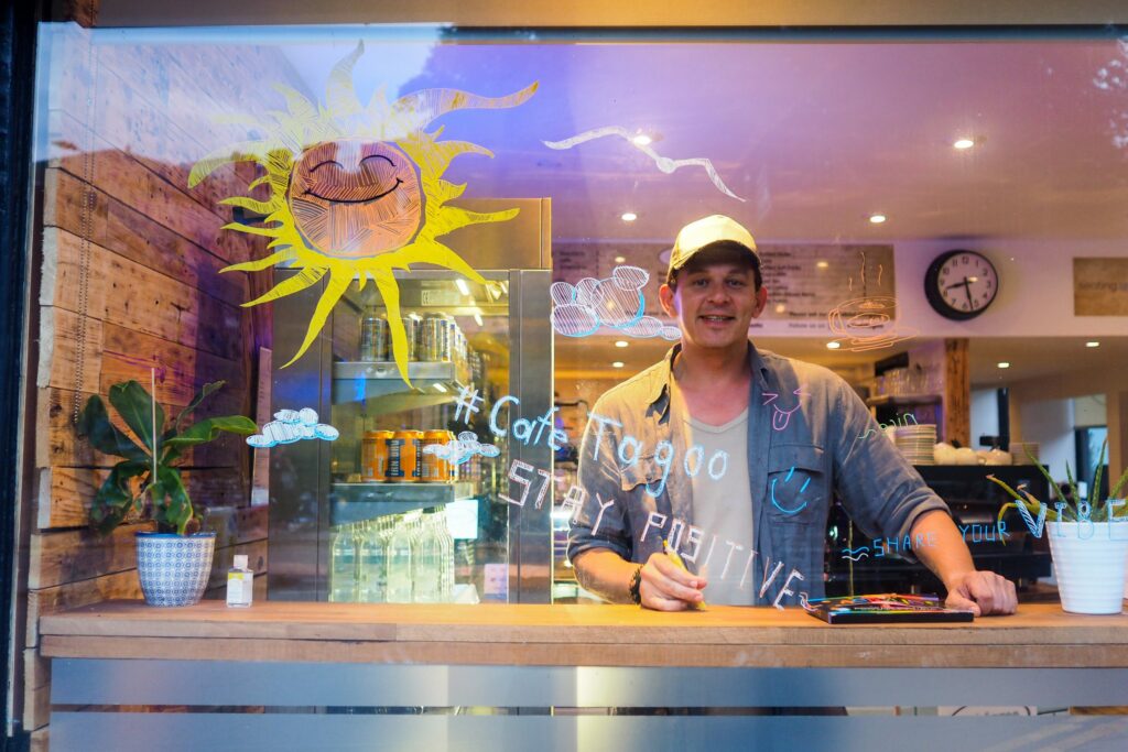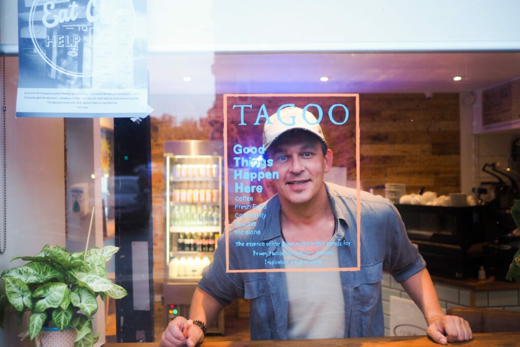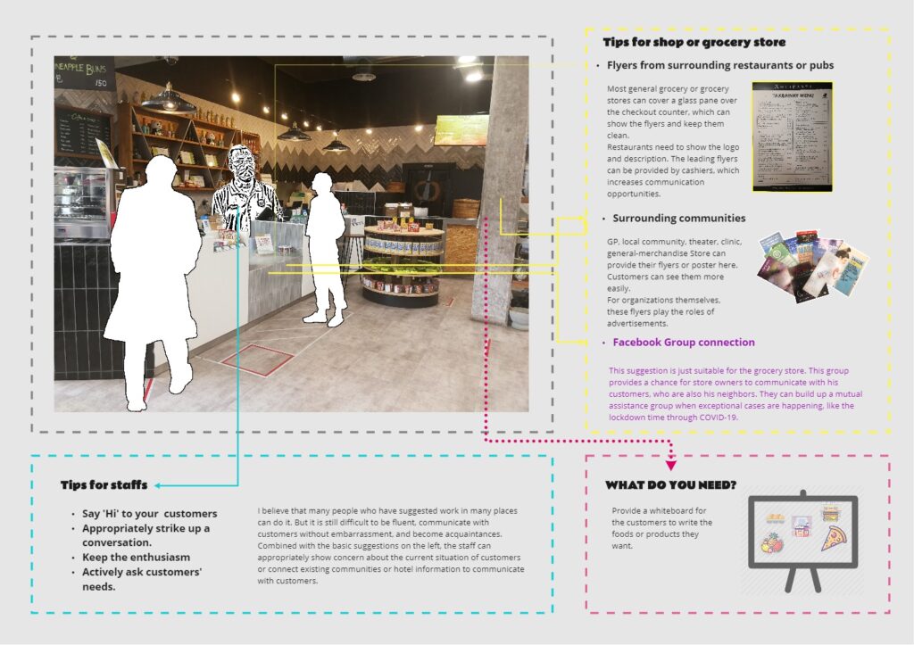 I applied the neighbourhood“barrier” idea and design the information for front glass window in Cafetagoo. In this way, the guests passing by can accept the information, besides this is a promotion to the shop