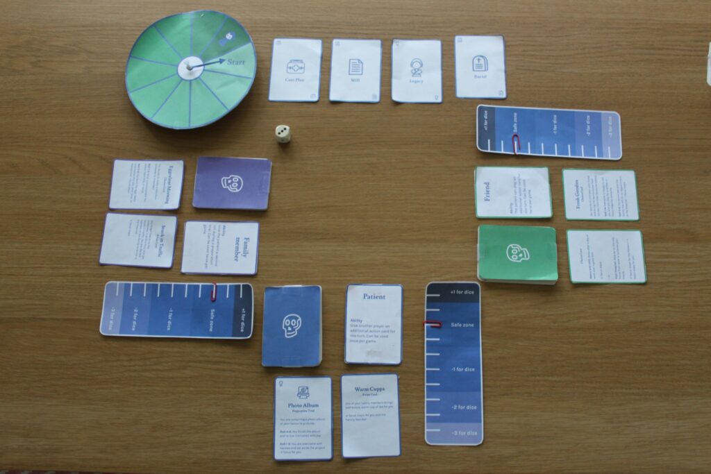 Each card provides a decision or event to advance the story (and game). Content of the cards is related to practical knowledge and resources about end of life to prompt reflection and discussion between the players throughout the game. Humour has also been used to ensure the experience is light and playful, but also informative.