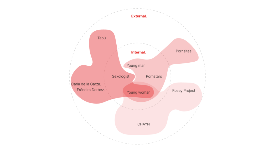 This is a general view of all the stakeholders involved in this project, from the expert's stakeholders area, I had the chance to interview Alicia Delicia (sexologist and adult film actress), Claudia de la Garza, Eréndira Derbez (writers of the book No son micro: Machismos cotidianos), Mia Davis (CEO of Talk Tabu), Paula Manners (Rosey Project) and Robert Jensen (Teacher, writer and participant as an expert in the Netflix documentary: Liberated, the new sexual revolution) and more.