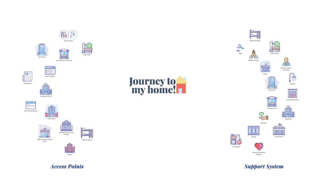 The research was conducted using multiple mediums to facilitate the conversation and gather insights into the current situation around homelessness. Digital Ethnography, Interviews, Workshops and Journey Mapping exercises were some methods brought into play during the research process. The diverse stakeholder group represented policymaking, frontline workers and personal experience to have a holistic perspective about the challenge.