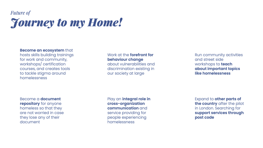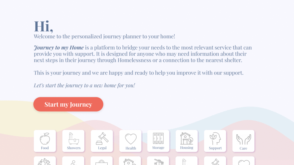 'Journey to my Home!' is a digital platform that acts as a personal mentor for anyone experiencing homelessness. It is a custom navigator for the user and designs the most appropriate journey for their homelessness after processing answers of some initial questions about personal nature, disability, employment experience and current housing situation.