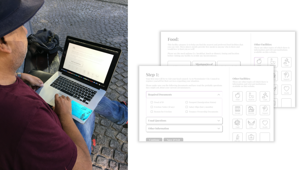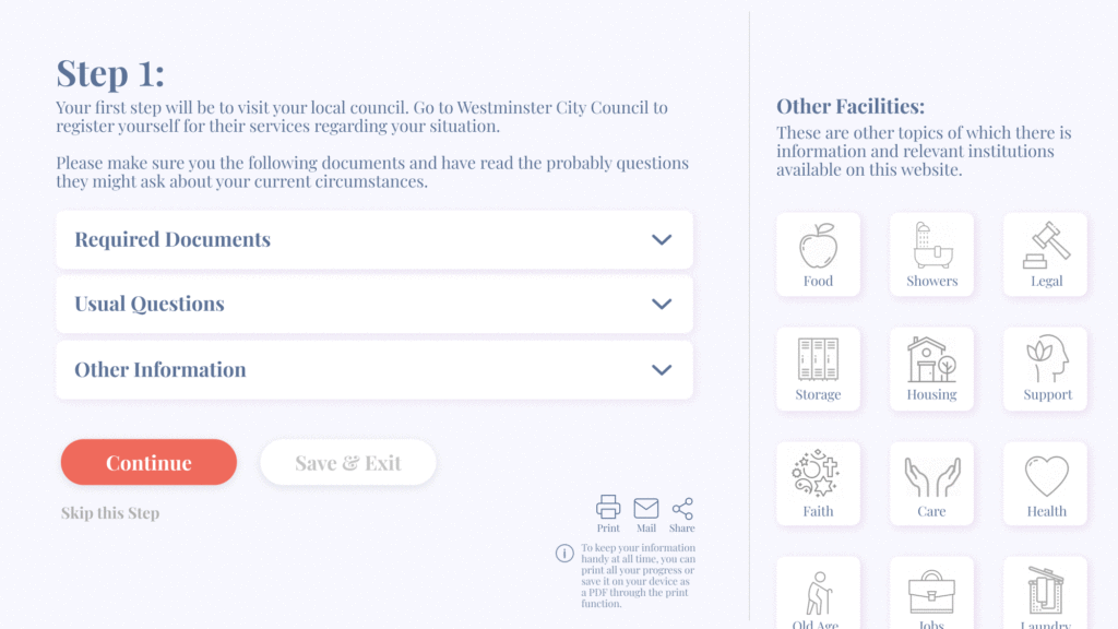 After processing the answers and understanding the person's circumstances, it breaks down their journey in few steps. For every step (that could be an interaction with a local authority), it provides documents checklist, usual questions and other important information about their contact details, working hours and emergency numbers. The user is asked to record their response for the platform to know any help that might be received by them and what could be the next steps. Learning about the user's experience (with the authority) helps the platform decide their relevance in future journeys and their speciality. With all the essential support (for food, showers, storage etc.) mentioned on the page, it enables the person to quickly access other services that are needed but would not be part of their journey.