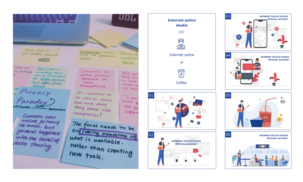 We are continually experiencing social network privacy leaks. In this case, users should pay attention to their privacy and avoid disclosing their personal information on the Internet. But they did not do so. This is called the "privacy paradox." These are all self-perception biases that lead to these dangerous behaviors. This is also the root cause of the user's privacy attitude in the "privacy paradox" phenomenon because users did not realize that this behavior has potential risks and wrong privacy protection methods. Internet police studio is a leisure and entertainment space that combines online platforms and offline cafes. It aims to help the public raise awareness of privacy protection and understand the value of personal privacy. The studio's official account provides content sharing about privacy experience, real cases, protection methods, and online service consultation with the Internet police. At the same time, the cafe is the offline platform of the internet police studio. Users can get a cup of coffee by sharing their experiences, and they can also communicate with the online police and other users one-on-one offline. In the future, users can also participate in offline workshops, online privacy lectures, or experience some privacy risk mini-games.