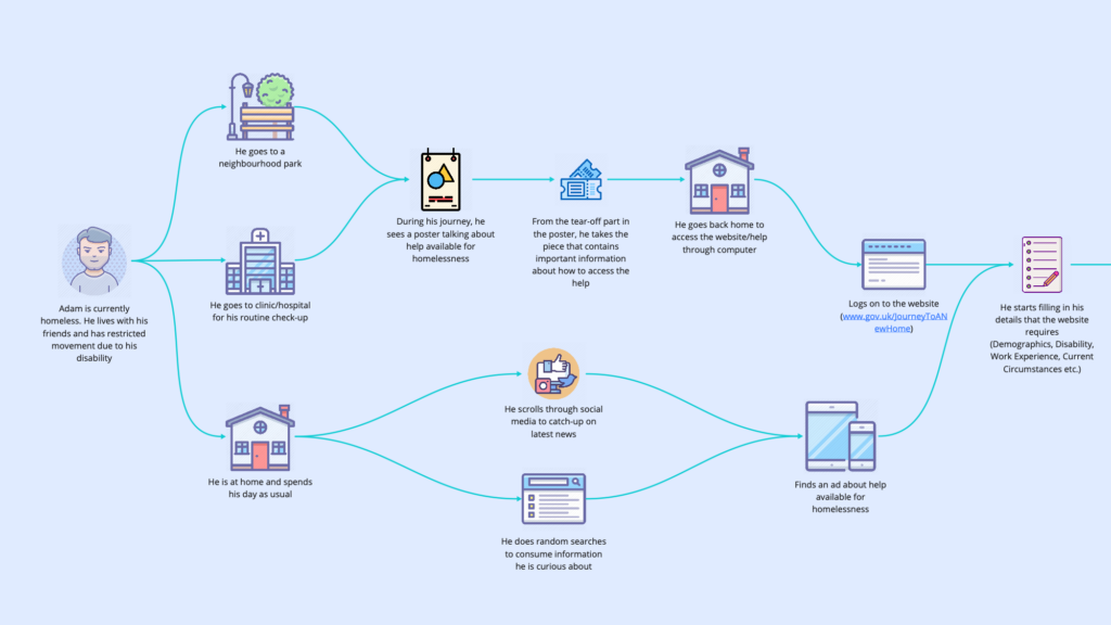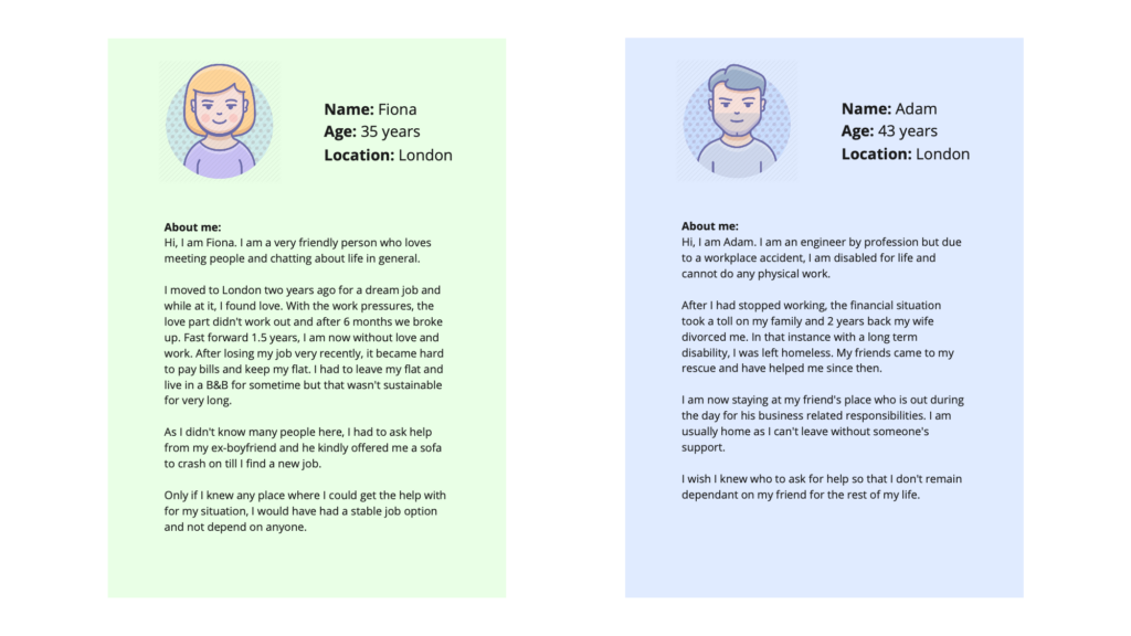 As every case of homelessness will bring different set of platform requirement, this platform is currently imagined for people very similar to the profile of Fiona and Adam.