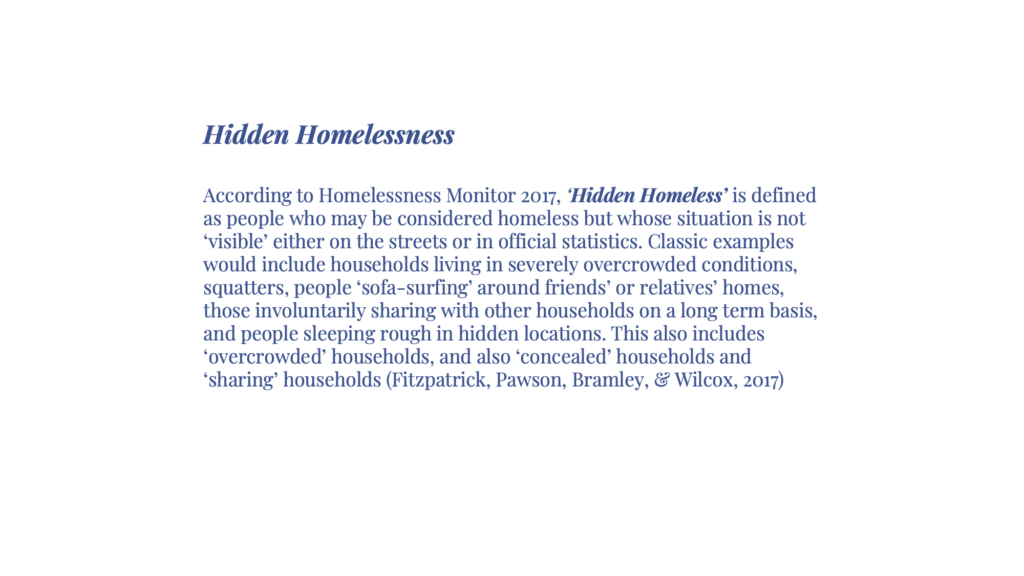 In the UK, more than 350,000 people are registered homeless. Looking at the definition of Homelessness, there are other types of homelessness that this number does not represent. According to sources, the data will be doubled if hidden homeless people were to be included in this count. My project is about understanding the challenges that people face while experiencing Hidden Homelessness and how can we provide adequate support so that they do not end up sleeping rough on streets.