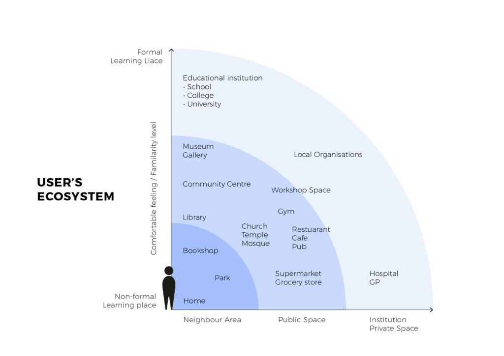 The diagram presented places mapping by familiarity level or frequency of visiting and type of place. Mostly of sample user would visit neighbour area and public space but rarely visit institutional space except a hospital.