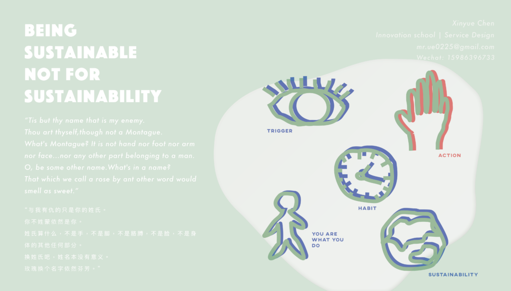 As we all know, the over-produce and over-consumption in the fashion industry has a huge impact on the living environment.The problem with the current consumer society is that consumer attitudes, values and environmental awareness do not play an important role in determining environmental consumer behavior.Most consumers still prioritize individualism even though they are aware of the serious impact clothing has on society. It is difficult for consumers to build relevant empathy.The recycled behavior can not give them a long-term connection or feedback which is beneficial to them, which leads to a low correlation between attitudes and actual actions.