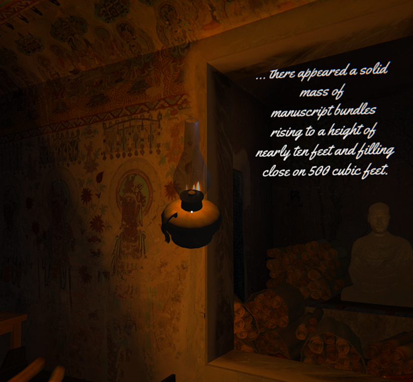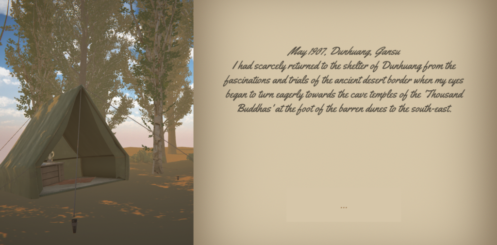 The Library Cave Opens is a short video game-like experience about Hungarian-British explorer and archaeologist Aurel Stein's stay at the Caves of the Thousand Buddhas near Dunhuang, China. Here, in 1900 a Daoist monk, Wang Yuanlu, discovered a sealed cave containing tens of thousands of manuscripts, paintings and secular documents dating from before the 11th century. The find comprises one of the most important discoveries for Chinese scholarship and today forms the basis of an entire field, Dunhuang Studies.