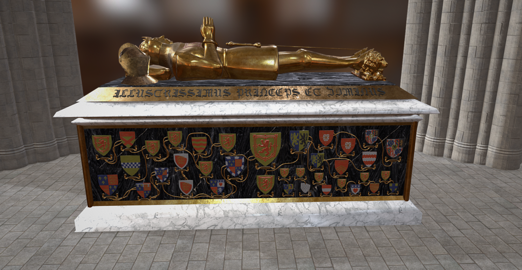 For annotations please view model in full screen. This model depicts a historical interpretation of what the tomb of James II of Scotland (1430-60) may have looked like. James II was King of Scots from 1437 until 1460 when he was accidentaly killed by an exploding cannon. He was buried in Holyrood Abbey in Edinburgh. The tomb was likely destroyed by an invading English army during the Anglo-Scottish wars in the 1540s. James was perhaps the first succesful king of the Stewart dynasty. At the time of his death he had the popular support of his nobles having won a civil war against the powerful Douglas family earlier in his reign. He married Mary of Guelders, a relation of the powerful Duke of Burgundy and was succeeded by a male heir in his son James. The tomb was modelled in 3ds Max based on historical research on Scotland and royal European tomb building in the 15th Century. Submited as part of a Masters Thesis in International Heritage Visualisation.