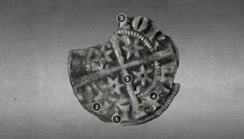 For annotations please view model in full screen. This penny was produced in Scotland between 1280 and 1286 during the reign of King Alexander III (1249-1286). Coinage had been produced in Scotland since the capture of English silver mines by King David I in 1138. Coins at this time were made by rolling out a weight of silver into a sheet and cutting it into discs. These were then placed on a small anvil bearing the king’s head design and struck with a steel punch bearing the cross design. This coin is of the 2nd recoinage of Alexander III’s reign and was issued from 1280 until his death in 1286. The recoinage of 1280 came at same time as English recoinage, replacing the recoinage of 1250 following his inauguration. The economic improvements during Alexander’s reign led to a boom in minting and his coins are among the most common medieval Scottish coins that can be found today. This model was created using photogrammetry before being optimised with the modelling software blender. Submited as part of Masters Thesis for International Heritage Visualisation.