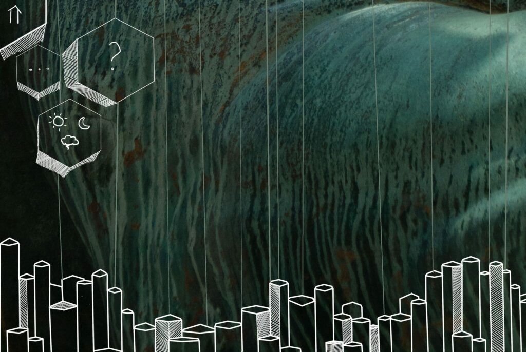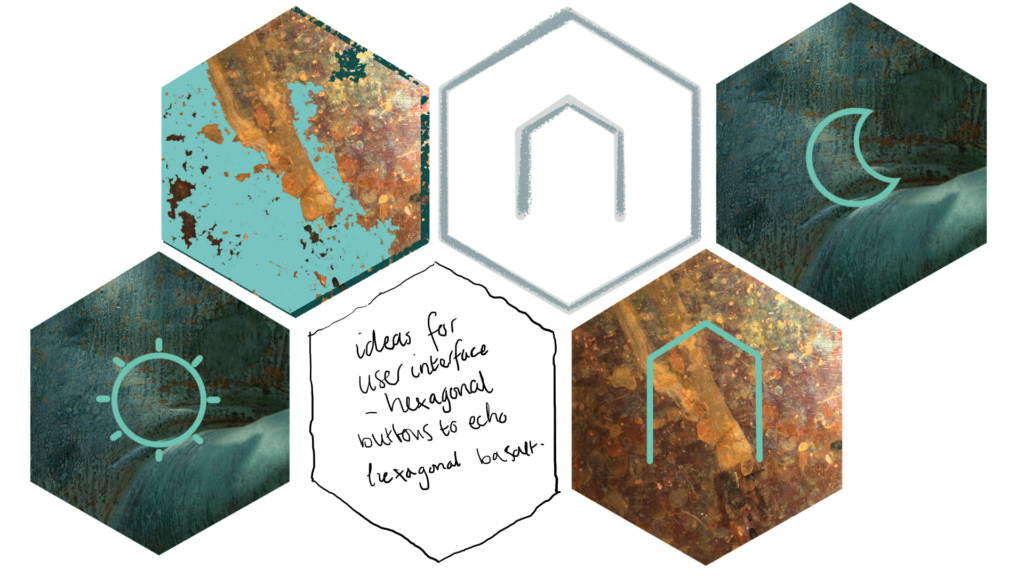 The design for the user interface was inspired in part by the hexagonal basalt columns of Fingal's Cave, but also by the concept of "Patina" and how this manifests on bronze materials